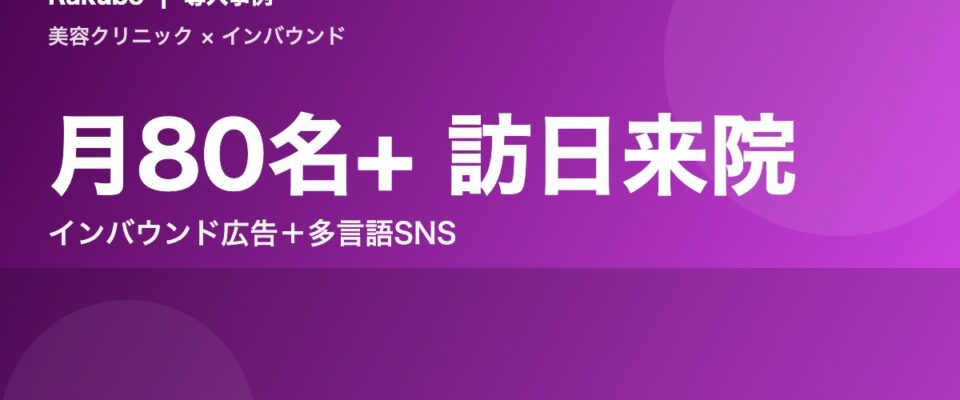 美容目的で訪日する外国人患者の集客を強化したい東京の美容クリニックに対し、訪日前後のチャネルを組み合わせたインバウンド広告とSNSを展開。月80名以上の訪日外国人の来院を安定的に獲得している事例です。