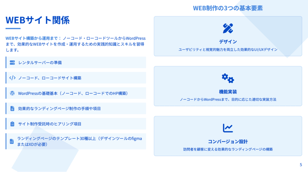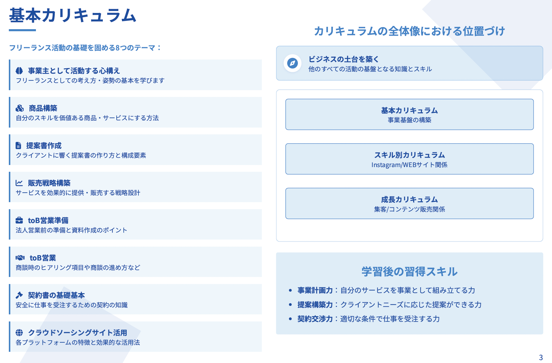 スキル獲得の初期段階から実践的な質向上、BtoB対応能力の強化まで、事業運営に必要なすべての要素を体系的に提供しています。