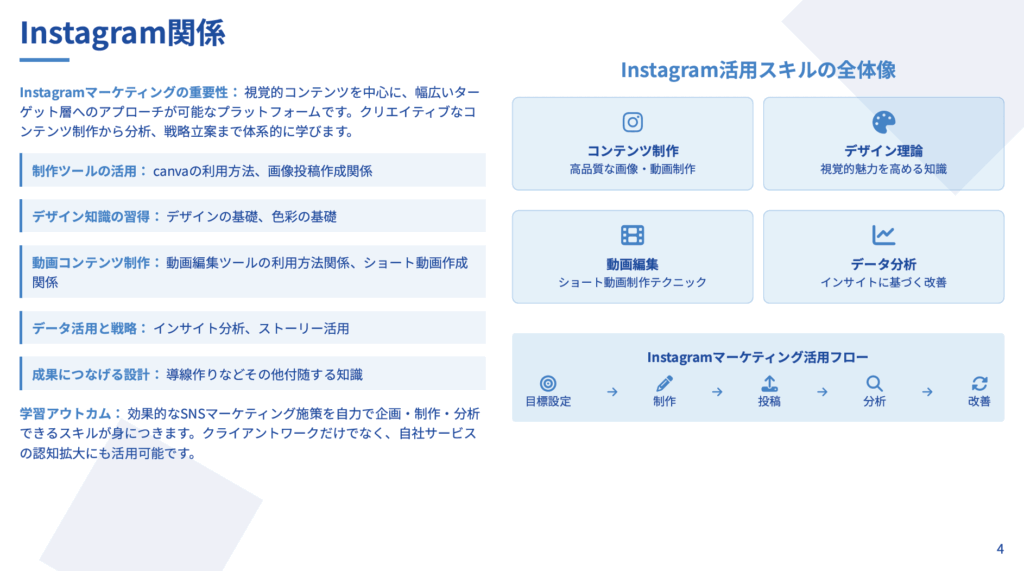 事業主としての心構えから、SNS運用を中心としたスキル獲得、WEBマーケティングを活用したBtoB集客、効果的な営業・提案手法、外注化のためのマニュアル作成まで、現場で即戦力となる実務能力をワンストップで学べる総合プログラムです。