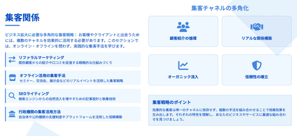 - 事業成長を目指す方: すでに独立されており事業の方向性は定まっているものの、月商20万円未満で安定的な収益基盤の構築や効果的なマーケティング手法を習得したい方