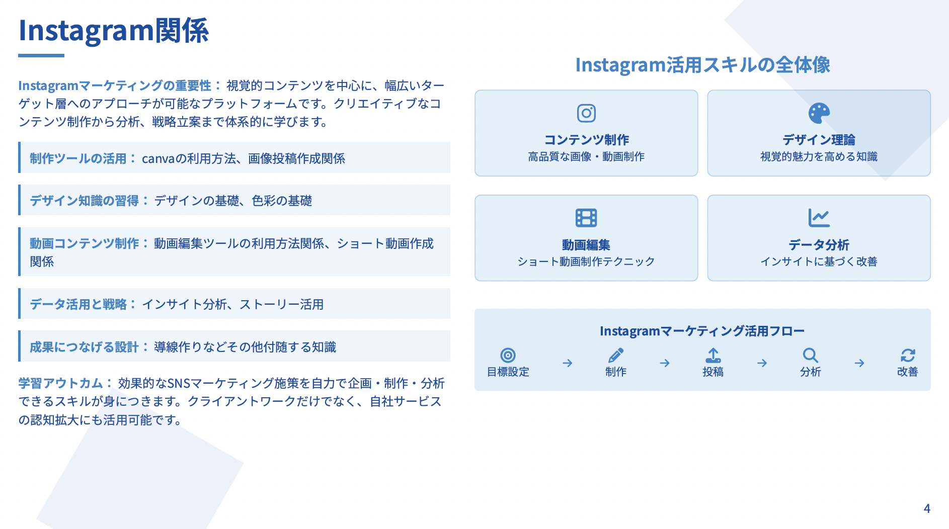 事業主としての心構えから、SNS運用を中心としたスキル獲得、WEBマーケティングを活用したBtoB集客、効果的な営業・提案手法、外注化のためのマニュアル作成まで、現場で即戦力となる実務能力をワンストップで学べる総合プログラムです。