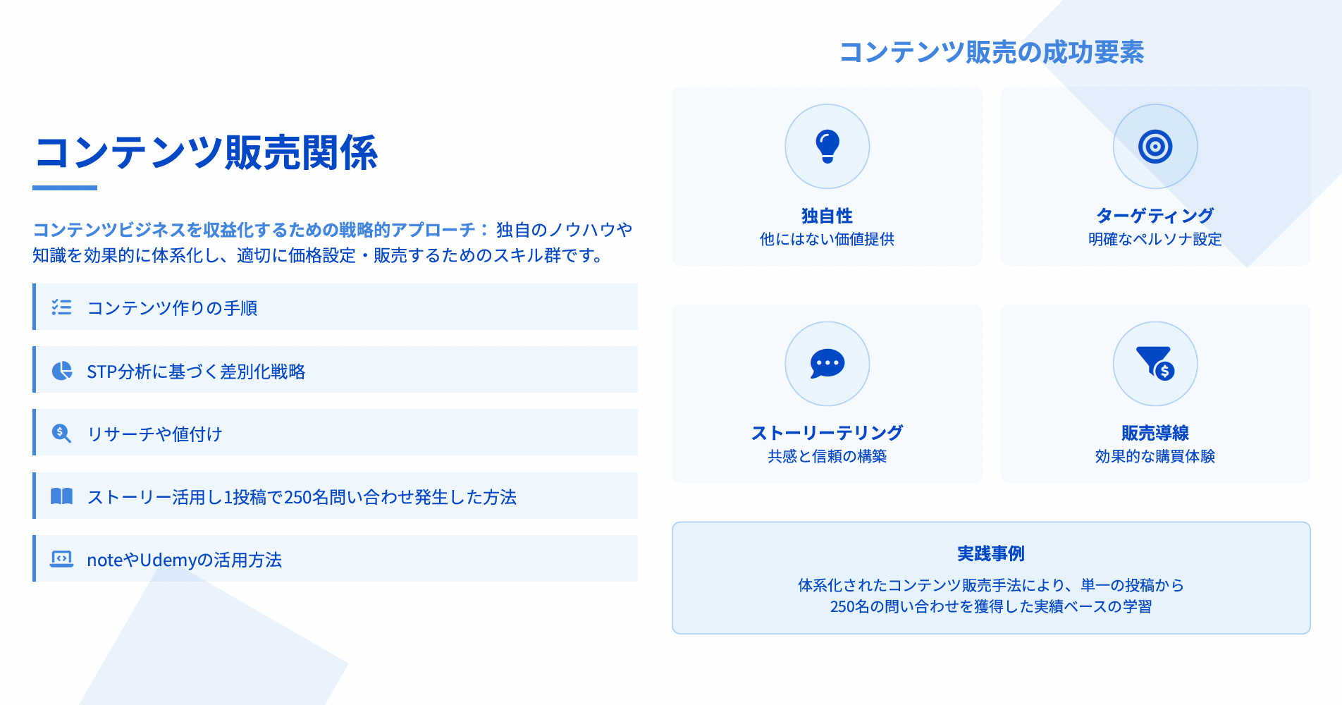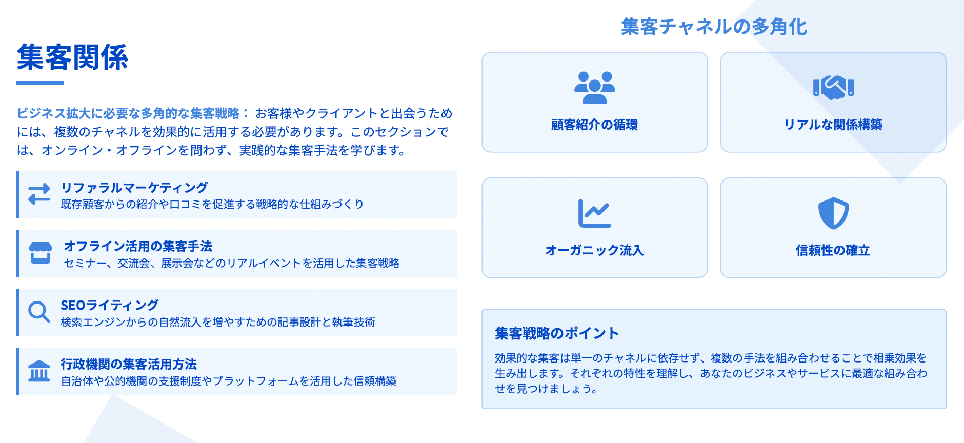 - 事業成長を目指す方: すでに独立されており事業の方向性は定まっているものの、月商20万円未満で安定的な収益基盤の構築や効果的なマーケティング手法を習得したい方